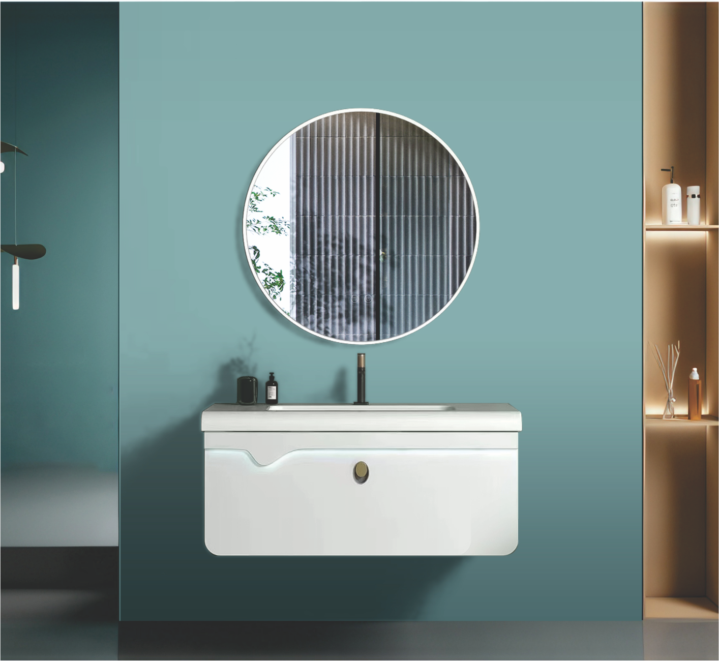 Trang chủ » Sản Phẩm » Thiết bị vệ sinh phòng tắm » Bộ tủ chậu phòng tắm tối giản, gương tròn – TN8816