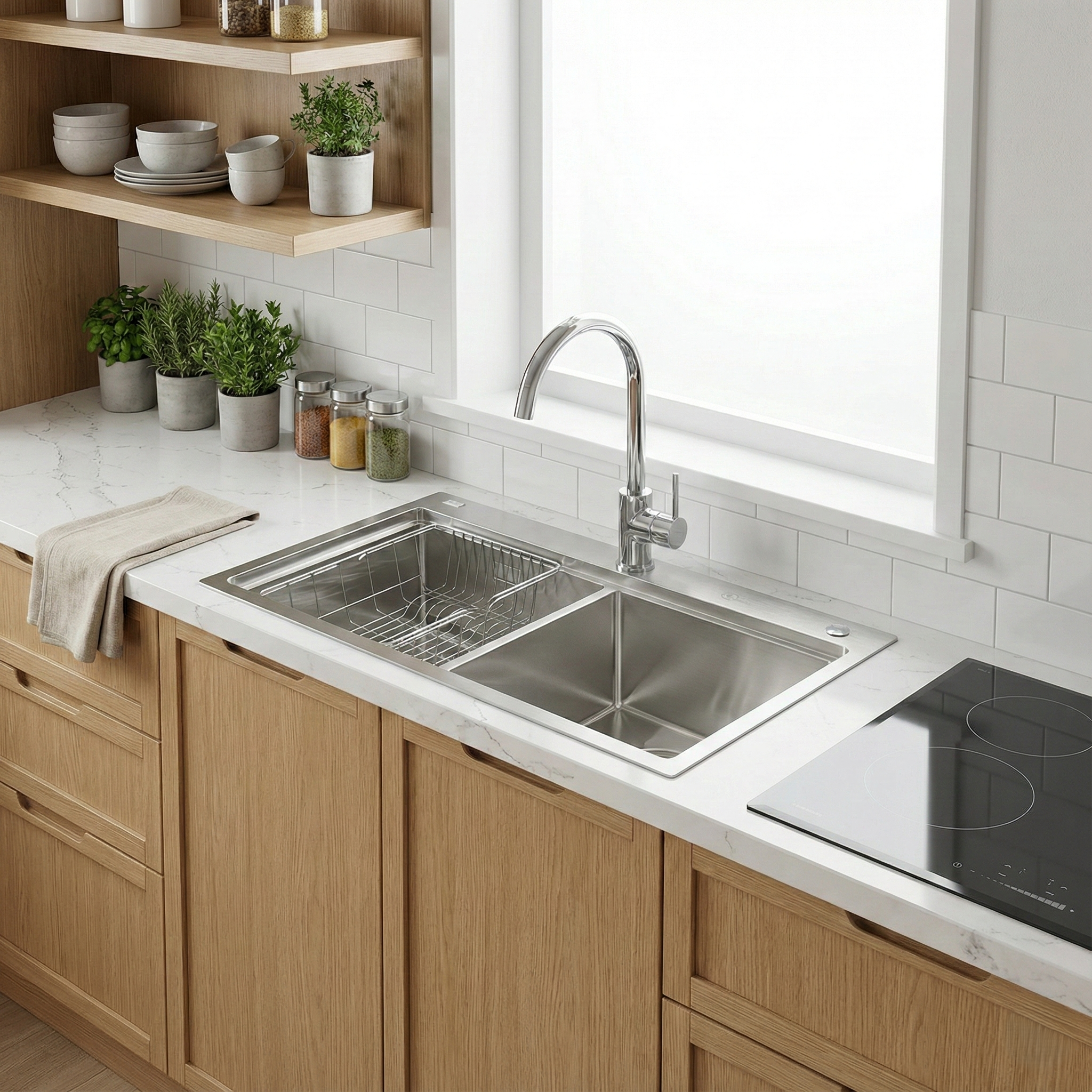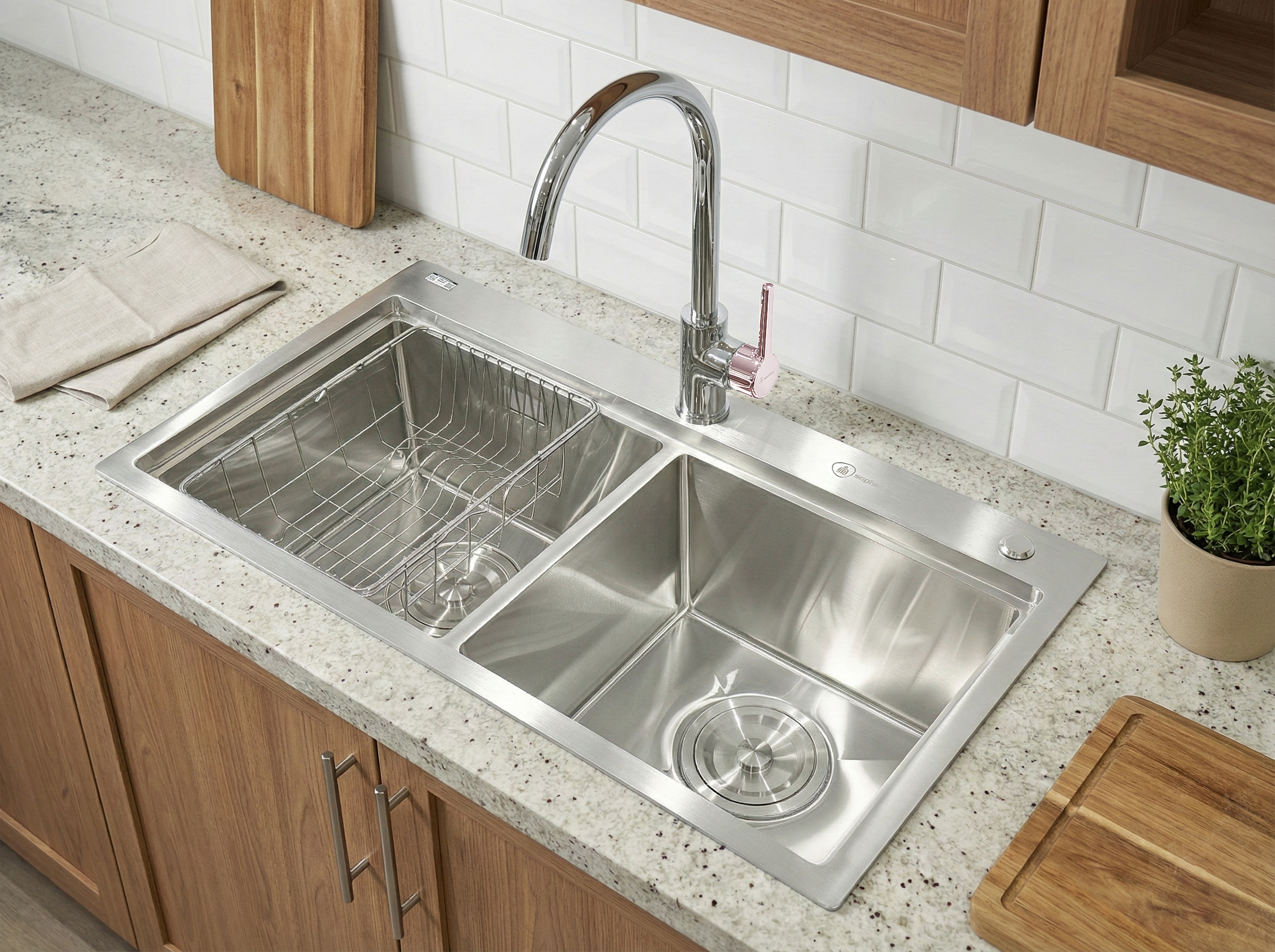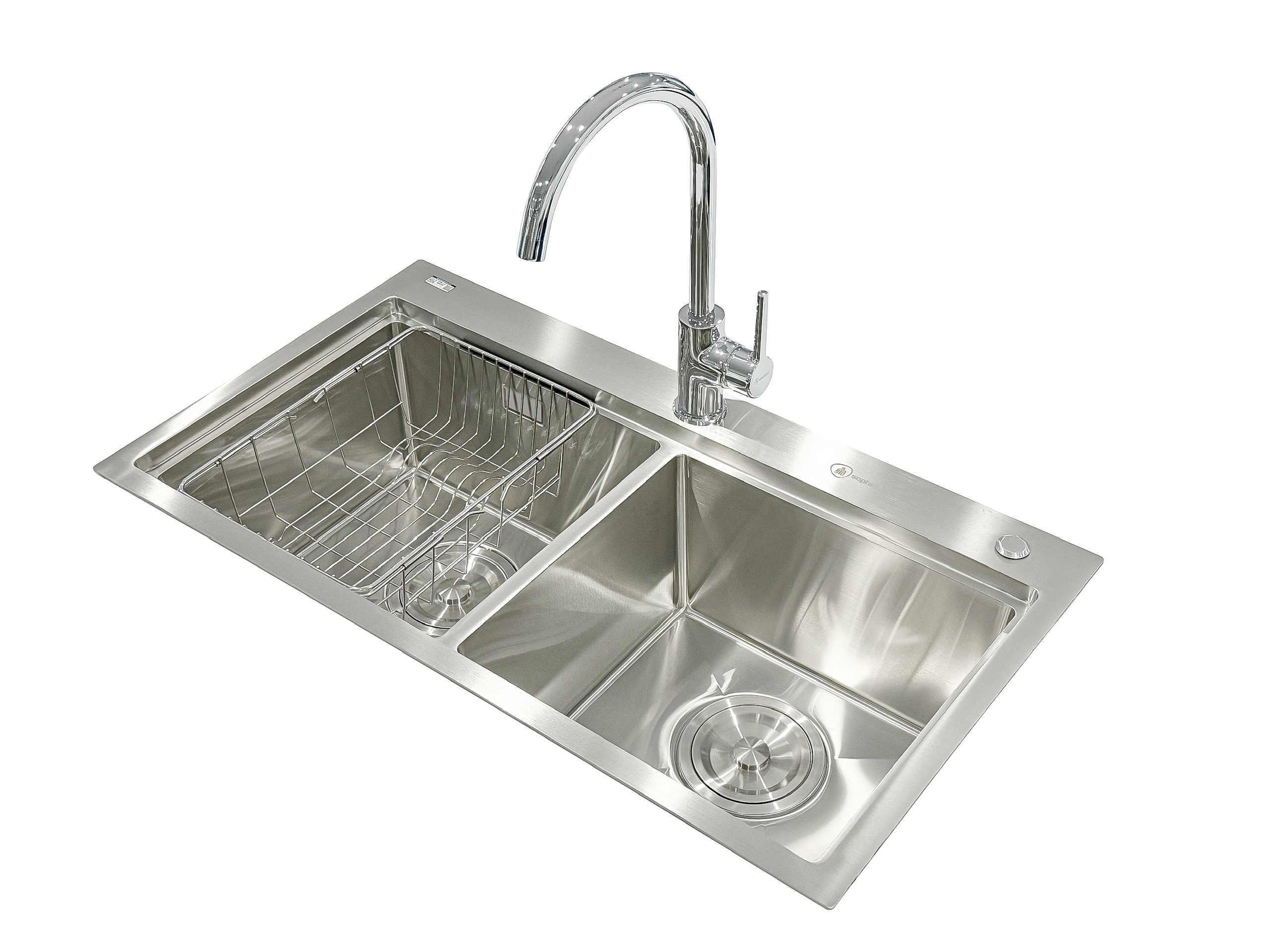 Chậu rửa bát 2 ngăn inox 304 cao cấp – SC8346 | Thuộc dòng sản phẩm chậu rửa bát lắp dương 2 ngăn cao cấp của Saphias. Sản phẩm SC8346 gồm 2 ngăn chứa, 3 lỗ lắp 1 vòi chậu và dung dịch tẩy rửa (hoặc đường cấp nước lọc) cực kì tiện dụng . Thiết kế hiện đại kết hợp phụ kiện rổ inox và thớt gỗ trượt đi kèm giúp đáp ứng nhu cầu sử dụng tối đa nhưng vẫn rất gọn gàng, tiết kiệm không gian. Chậu rửa bát 2 ngăn inox 304 cao cấp – SC8346 và sản phẩm vòi chậu rửa bát Saphias là những lựa chọn tuyệt vời cho một ngôi nhà lý tưởng.
