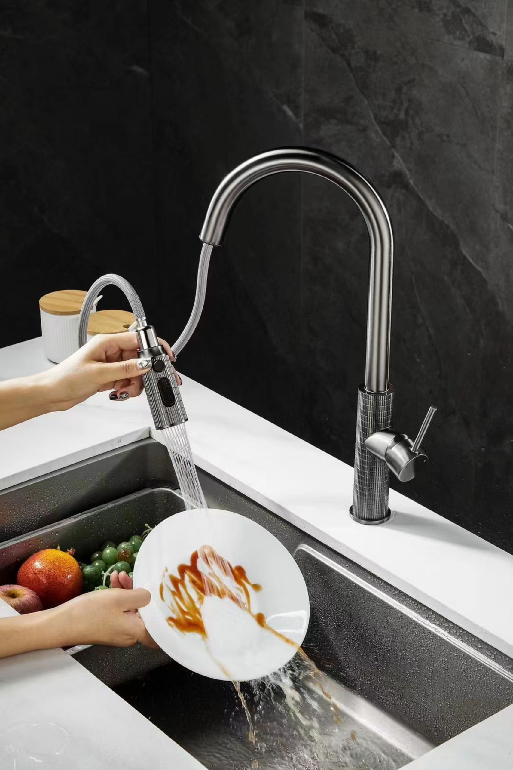Vòi chậu rửa bát mạ crom cao cấp – SF496X | Thuộc dòng sản phẩm vòi nóng lạnh gắn tường (2 đường nước) mạ Xám PVD (5 lớp) trên dây chuyền Nhật Bản, với đầu vòi 2 chế độ xả và cơ chế kéo rút tiện lợi, chạm đến mọi khu vực sinh hoạt. SF496X của Saphias là là lựa chọn hoàn hảo khi khi kết hợp với chậu rửa bát 2 ngăn hoặc chậu rửa bát 1 ngăn , đáp ứng mọi nhu cầu trong không gian phòng bếp của gia đình bạn.